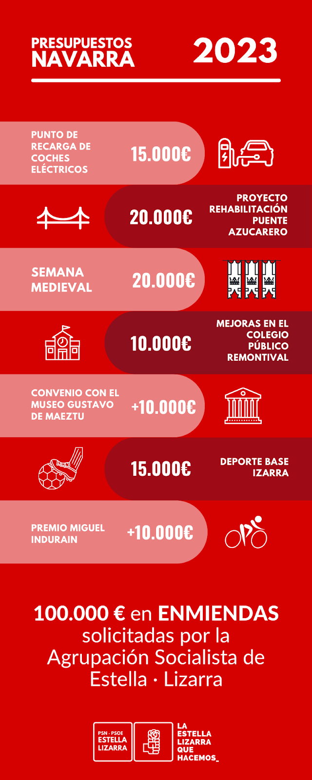 Por otro lado, valoramos positivamente la aprobación por unanimidad de las enmiendas solicitadas por el PSN-PSOE de Estella-Lizarra por valor de 100.000 € para colocación de punto de recarga de coches eléctricos, la Semana Medieval, actividades del Museo Gustavo de Maeztu, Gran Premio Miguel Indurain, inversión y mejoras en el Colegio Remontival, proyecto para la recuperación y adecuación del Puente del Azucarero y el deporte base del Izarra.